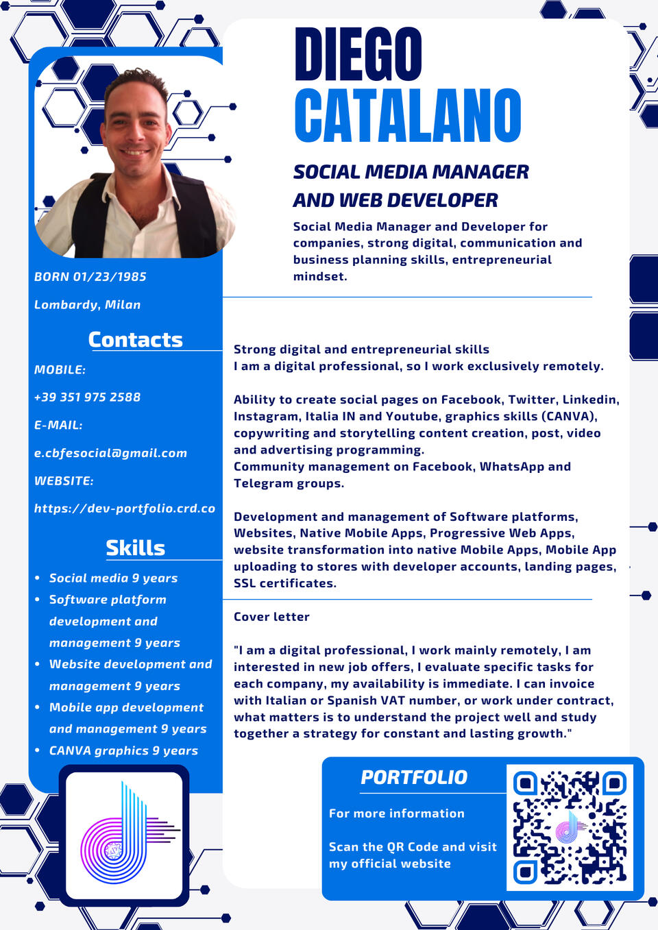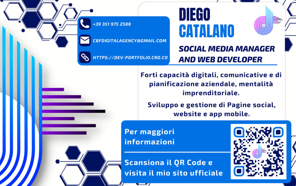 Hi, my name is Diego, I am Italian, born in Milan in 1985, I have been living in Spain for two years, I collaborate with companies in Madrid, Barcelona, Valencia and Torrevieja. I have been working in digital marketing and growth hacking for 10 years.I can manage your digital content and your online community, bringing your social channels from 15,000 to 30,000 real monthly views throughout the year, I do it with a daily work of publishing and sharing in the various area and specific sector groups, with various profiles created online and with searched keywords.I am a Social Media Developer, so I take care of your online image at 360 degrees, starting from your logo, with software like Canva I create graphics and coordinated posts with company colors and slogans chosen together with you, digital content and graphics in forms suitable for each social network.Your digital image and your posts will always be recognizable and consistent with your brand regardless of the social networks that customers use, be they Facebook, Instagram, Linkedin or Google.My communication style is young, dynamic and fun, but also serious and institutional when necessary, this style is reflected in my graphics developed in such a way as to leave an indelible and recognizable mark in the eyes of your future customer.I also develop websites, software platforms and mobile apps, I can create your company app consistent with the chosen communication and various landing pages to increase the engagement of new customers.